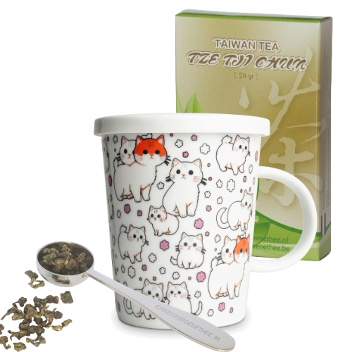 Cadeau-aanbieding: 50 gram groene thee + een theebeker ‘Poezen’ + een maatlepel samen voor € 19,95.