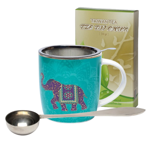 Cadeau-idee: Theebeker ‘Olifant’ met zeefje + 50 gram groene thee + een maatlepel samen voor € 17,50.