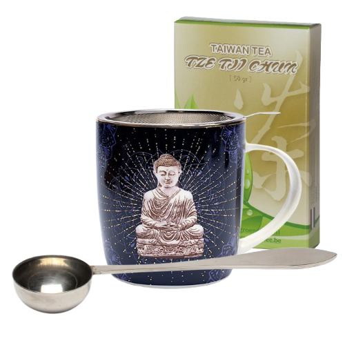 Cadeau-aanbieding 2: Theebeker ‘Boeddha Blauw’ met zeefje + 50 gram Taiwan groene thee + een maatlepel samen voor € 17,50.