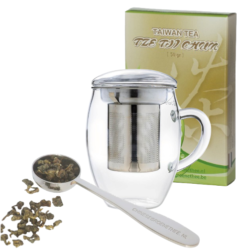 Cadeau-aanbieding 2: Theeglas met stalen filter en deksel + 50 gram Taiwan groene thee + een maatlepel samen voor € 19,95.