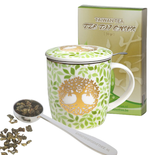Cadeau-aanbieding 3: Theebeker ‘Levensboom Groen Goud' + 50 gram Taiwan groene thee + een maatlepel samen voor € 19,95.