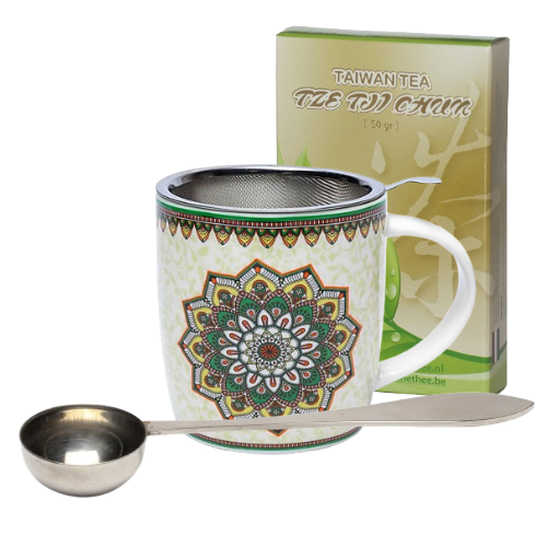 Cadeau-aanbieding: Theebeker ‘Mandala Groen’ met zeefje + 50 gram groene thee + een maatlepel samen voor € 17,50.