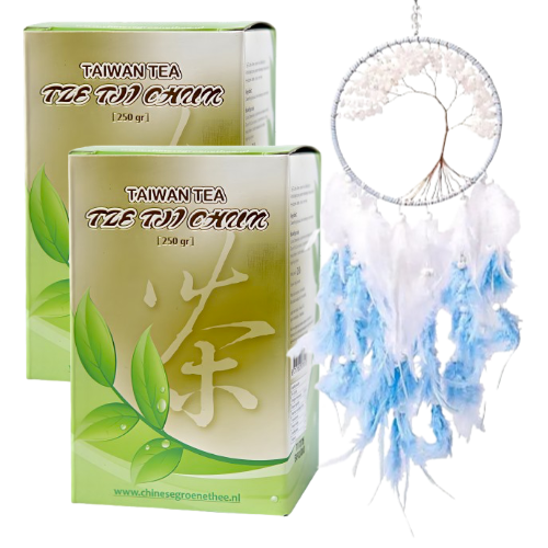 Aanbieding in de maand februari: 2 pakken Tze Tji Chun van 250 gram en een Dromenvanger Levensboom Witte Jade samen voor € 78,95.