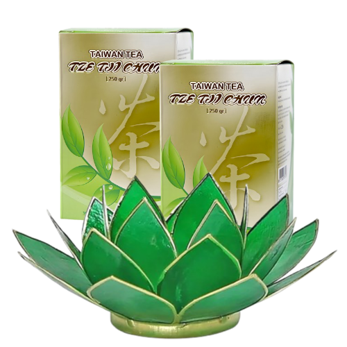 Aanbieding in de maand december: 2 pakken Tze Tji Chun van 250 gram en een Lotusbloem Sfeerlicht Groen met luxe cadeaudoos, handgemaakt van echte schelpen van € 62,90 voor € 52,90!