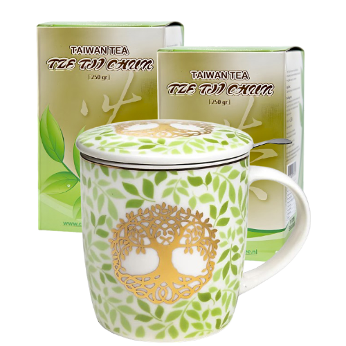 Aanbieding in de maand oktober: 2 pakken Tze Tji Chun van 250 gram en een theebeker 'Levensboom Groen' samen voor € 53,90!
