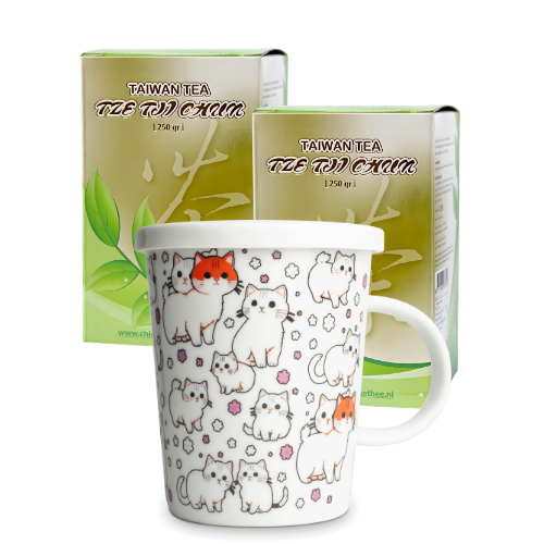 Aanbieding in de maand december: 2 x 250 gram Tze Tji Chun groene thee en een theebeker 'Poezen' van € 65,40 voor € 52,90.