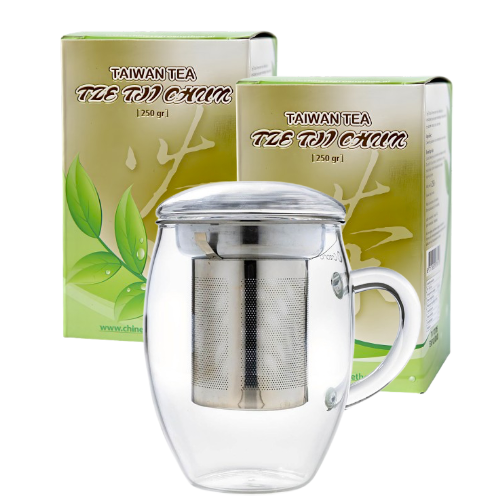 Aanbieding in de maand november: 2 x 250 gram Tze Tji Chun groene thee en een theeglas met glazen deksel en stalen filter samen voor € 52,90.