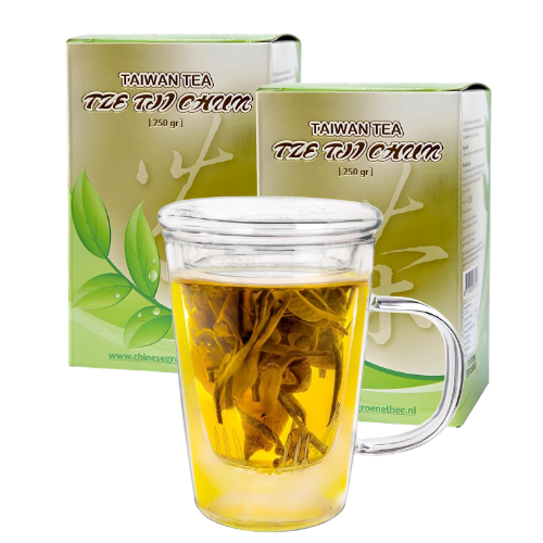 Aanbieding in de maand november: 2 x 250 gram Tze Tji Chun groene thee en een theeglas met glazen filter samen voor € 52,90.