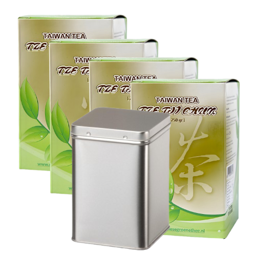 Aanbieding in de maand okotber: bij bestelling van 4 x 250 gram Tze Tji Chun groene thee een zilverkleurige bewaarbus 500cc gratis! Bovendien heeft u bij deze bestelling geen verzendkosten!