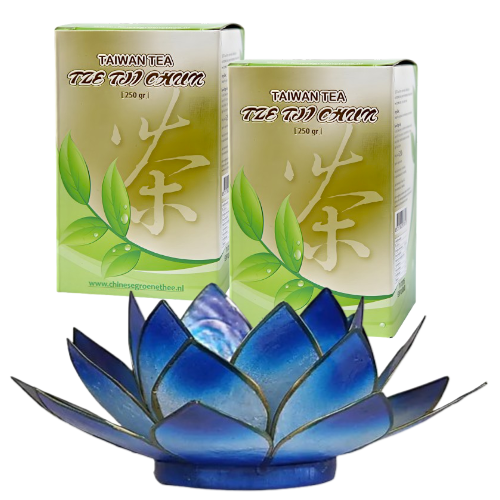 Aanbieding in de maand januari: 2 pakken Tze Tji Chun Taiwan groene thee van 250 gram en een Sfeerlicht Lotusbloem Blauw met luxe cadeaudoos, handgemaakt van echte schelpen van € 64,- voor € 52,90!