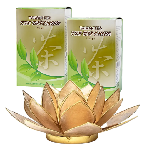 Aanbieding in de maand januari: 2 pakken Tze Tji Chun Taiwan groene thee van 250 gram en een Sfeerlicht Lotusbloem Smoked met luxe cadeaudoos, handgemaakt van echte schelpen van € 64,- voor € 52,90!